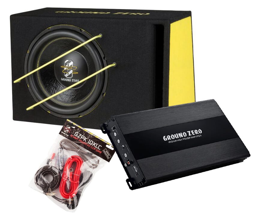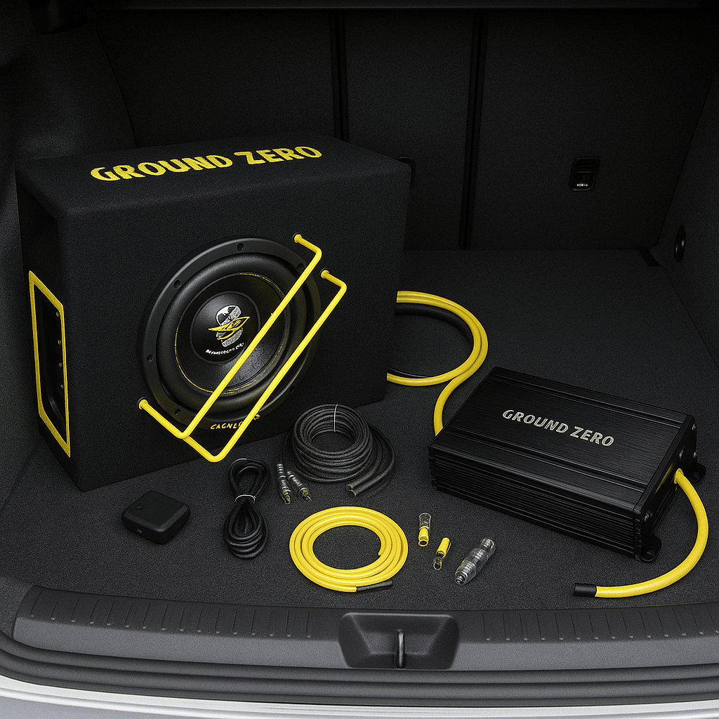 Komplett 12" basspakke med forsterker og det som trengs av kabler for å montere denne pakken.