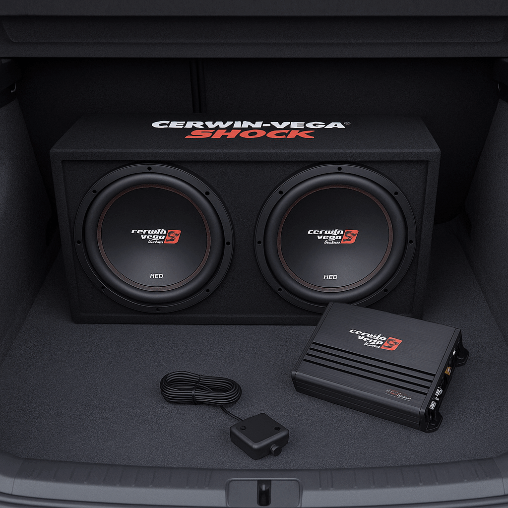 Komplett basspakke fra legendariske Cerwin Vega med dobbel 12 tommers basskasse og forsterker som spiller optimalt i sammen. Forsterkeren har vanlig rca inngang men også høynivå slik at de uten linjeutgang fra radio kan få ekte Cerwin Vega bass i bilen sin.