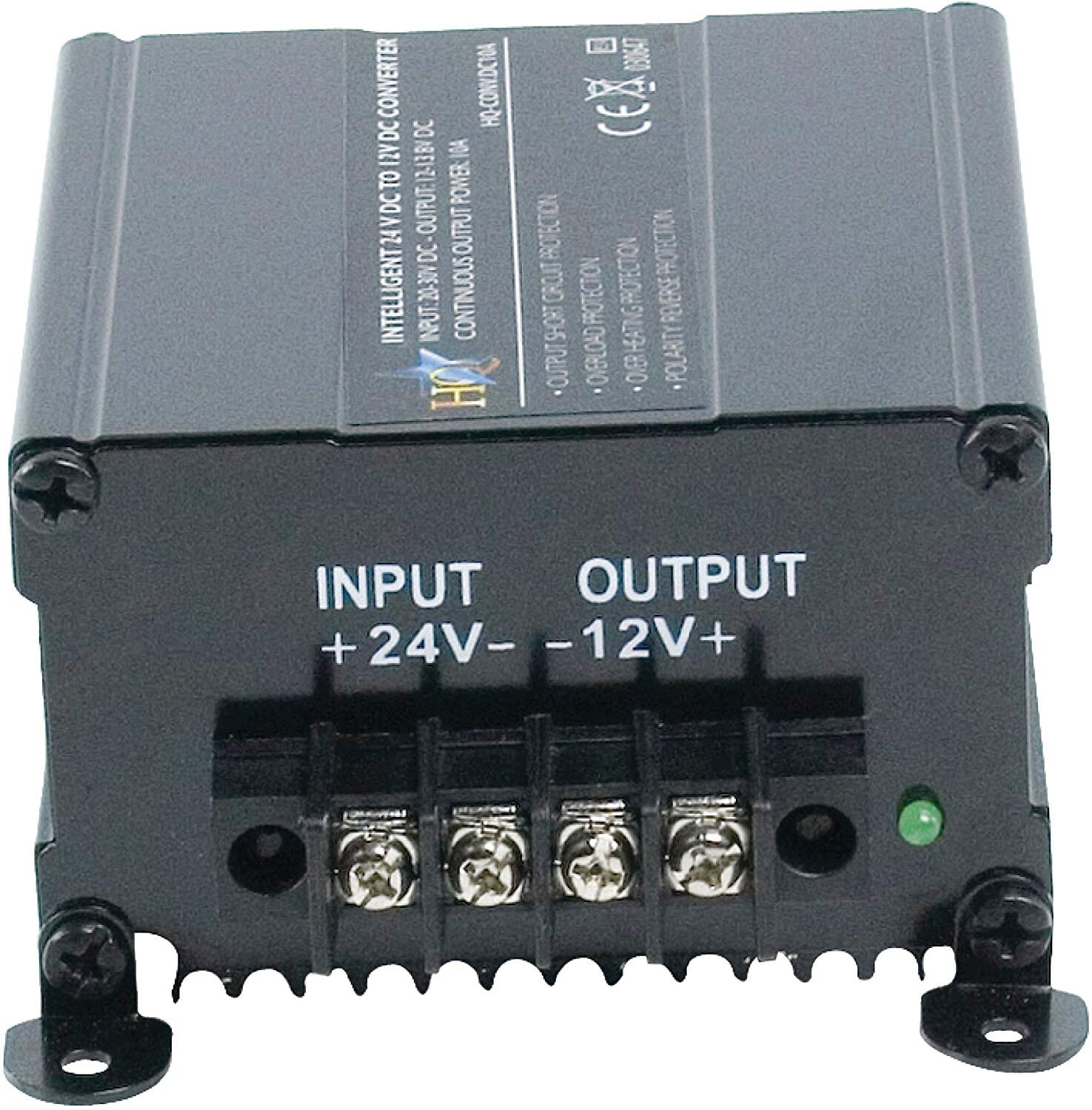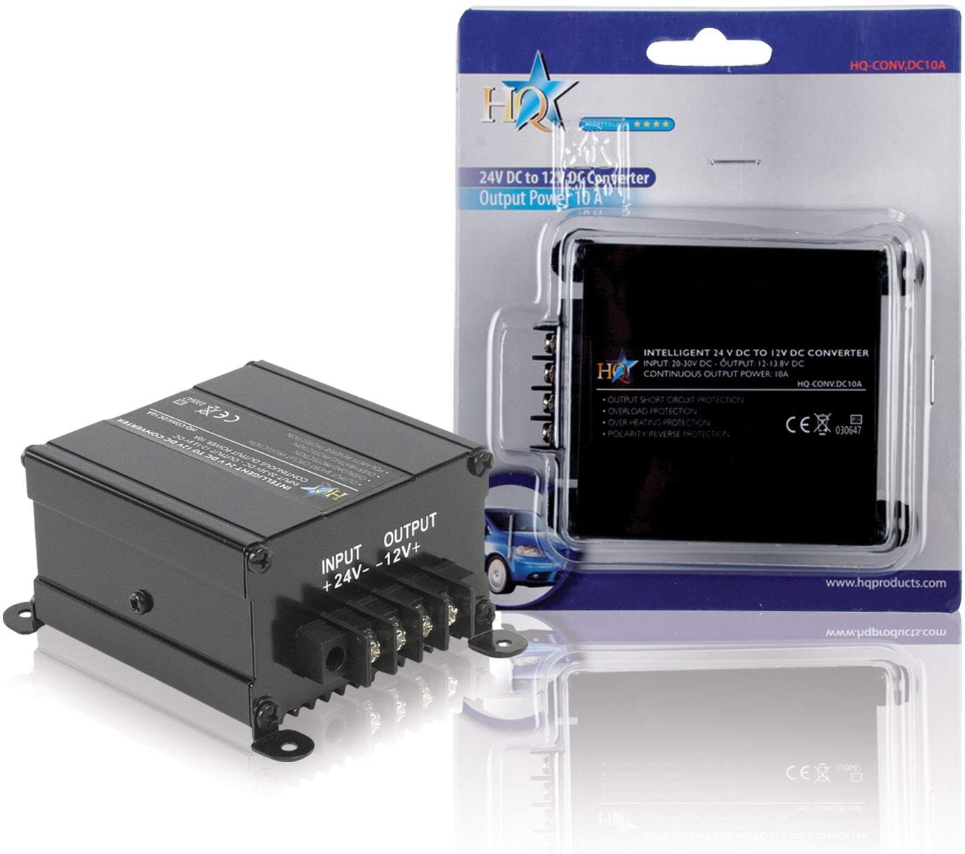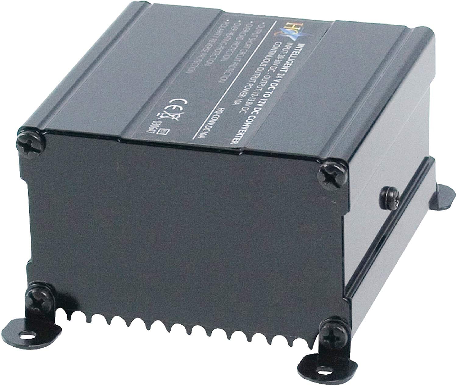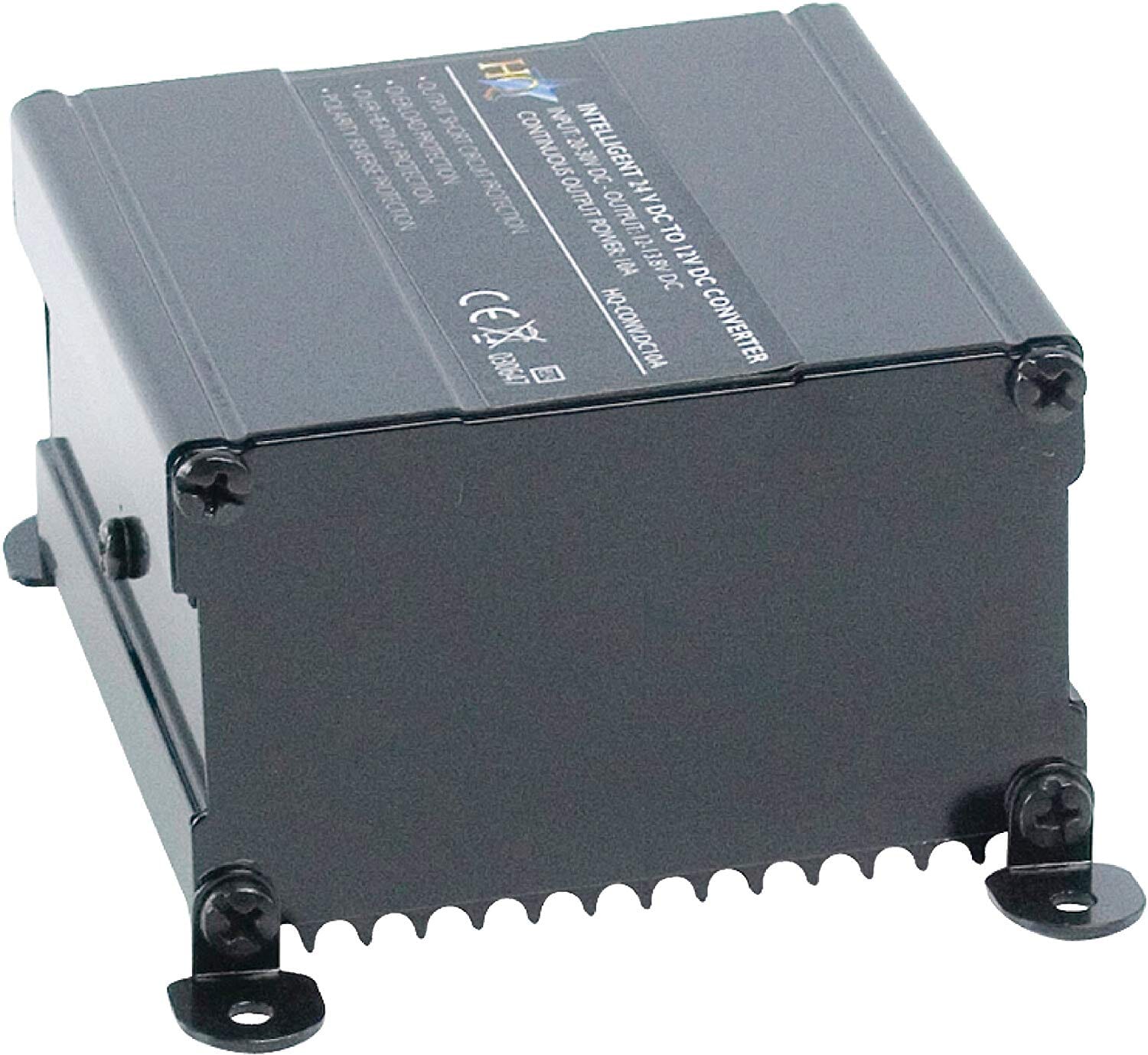 Switching converter for connecting 12V equipment to 24V battery. This fused converter has got output short circuit protection, overheating protection and overload protection. With E-mark approval, which is obliged since October 2002.